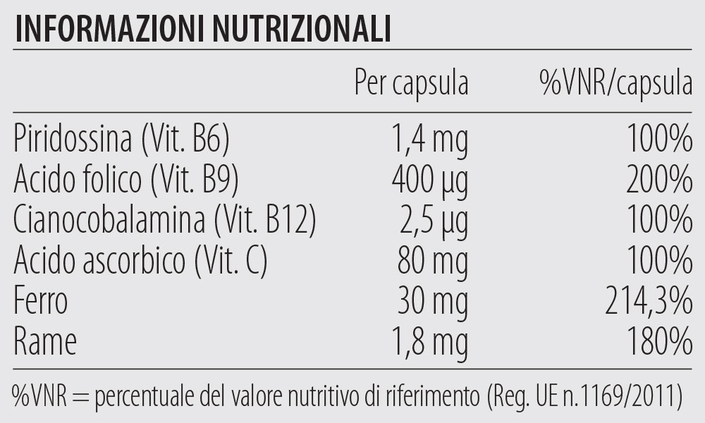 INGREDIENTI: Contenuto della capsula: Ferro solfato e Vitamina C in forma phytosomiale (ferro solfato, acido ascorbico, lecitina di girasole), Vitamina C, Agente di carica: Calcio fosfato bibasico, Rame gluconato, Agenti antiagglomeranti: Sali di magnesio degli acidi grassi, Silicio biossido; Vitamina B12 tit. 0,1% (cianocobalamina, maltodestrina, acidicanti: acido citrico, trisodio citrato), Piridossina cloridrato, Acido folico (Acido pteroil-monoglutammico). Involucro esterno: Idrossipropilmetilcellulosa, Colorante: Titanio biossido.